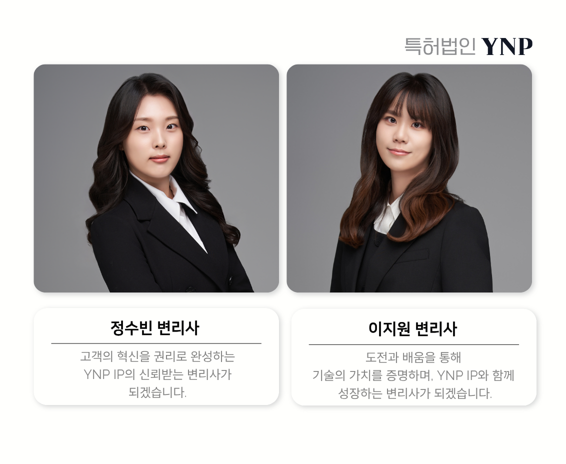 앞으로 YNP IP의 정수빈 변리사와 이지원 변리사는 바이오, 헬스 케어, 제약, 신재생 에너지, 화장품, 식품, 화학, 소프트웨어, 인공지능, IT-BT 융합기술 분야 발명에 관한 특허 업무를 수행할 예정입니다. YNP IP와 새로운 여정을 함께 할 변리사들에게 많은 응원 부탁드립니다.