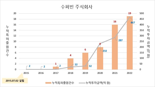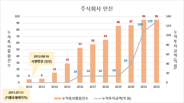 - ‘2030 국가온실가스감축목표(NDC) 상향안’이 발표되는 등 우호적인 정책 환경이 조성되었던 2021년에 대규모 투자를 유치했고, 같은 시기에 특허 출원건수가 크게 증가함