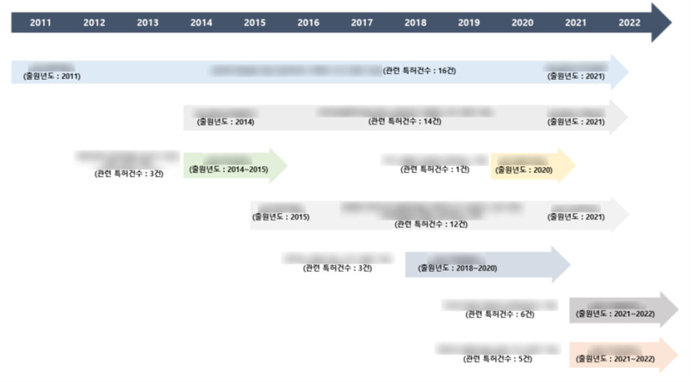 만약 시장에서 경쟁하고 있거나 관심을 가지고 계신 경쟁사가 있다면, 그 경쟁사가 보유하고 있는 특허를 살펴보고 영감을 얻는 것도 좋습니다. 경쟁사의 특허 포트폴리오를 분석해 보면, 그 경쟁사가 어떤 기술에 집중해서 특허활동을 하고 있는지 확인할 수 있고, 시계열적으로 나타나는 변화도 파악할 수 있습니다.
