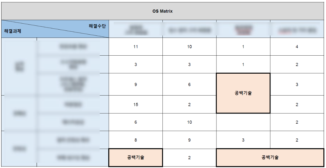 경쟁사가 보유하고 있는 특허를 과제(목적)와 해결 수단(구성)으로 라벨링해서 2차원 매트릭스를 만들어 보고, 이를 통해 공백영역(공백기술)을 탐색해 볼 수도 있습니다.