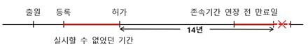 상한기간과 관련하여, 기존에는 허가 등의 절차로 인해 실시할 수 없었던 기간에 대하여 최대 5년의 기간까지는 제한 없이 존속기간 연장이 가능했으나, 앞으로는 의약품 허가 후 14년 이내의 기간까지만 존속기간 연장이 가능하고, 이를 초과하는 경우 거절결정 되도록 개정될 예정입니다.